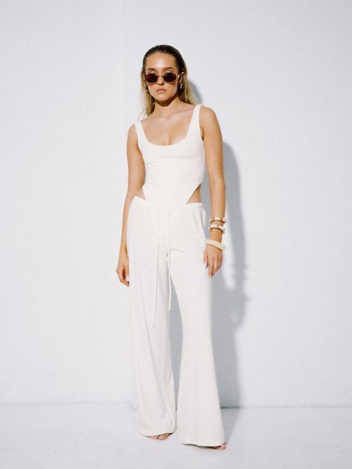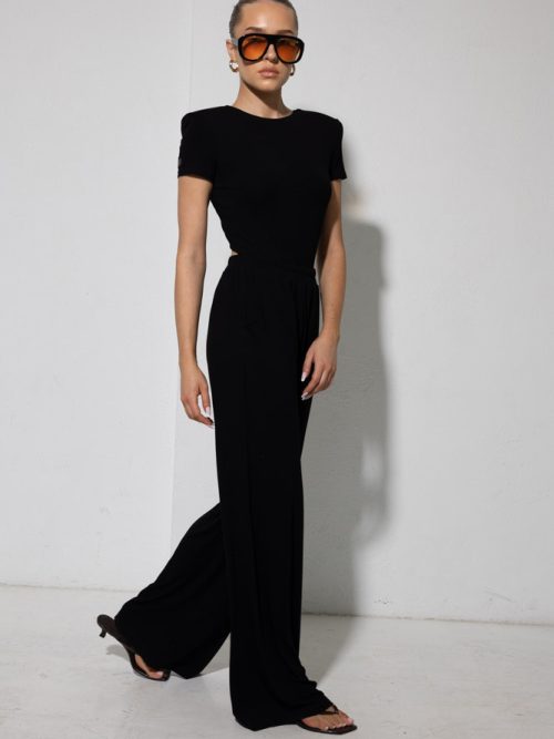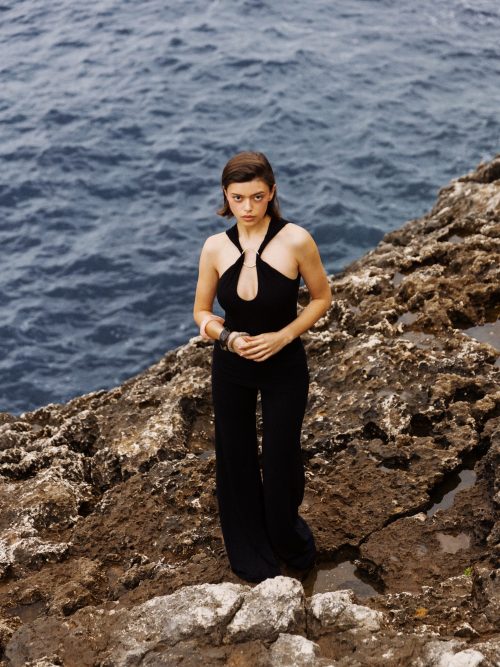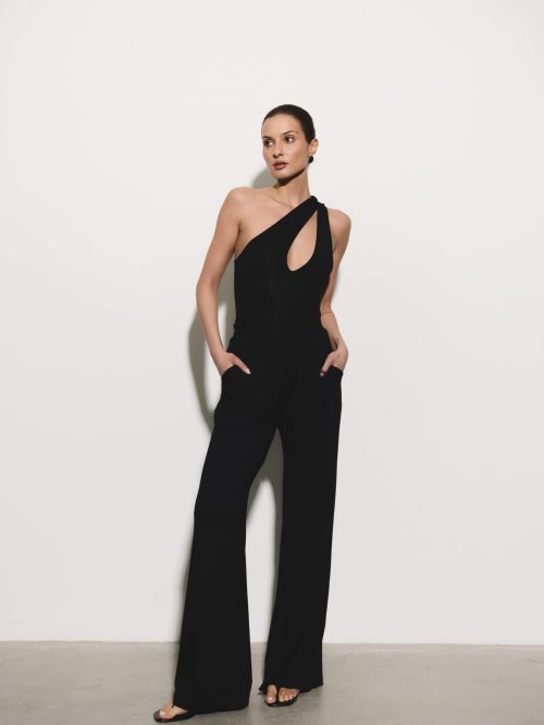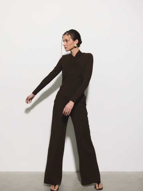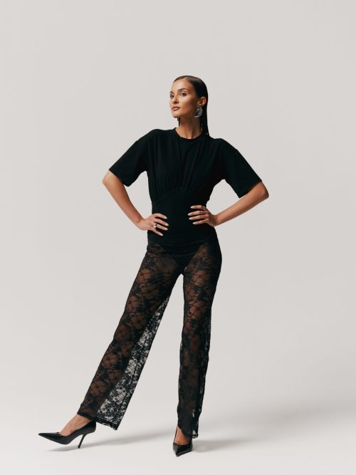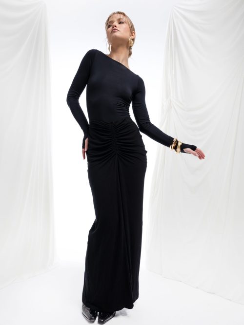 Marszczenia poprowadzone od ramion po biodra modelują sylwetkę i budują dopracowaną formę. Dół pozostaje dopasowany, stabilnie utrzymując linię ciała i równoważąc objętość góry.