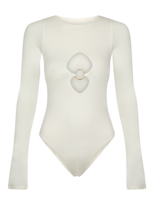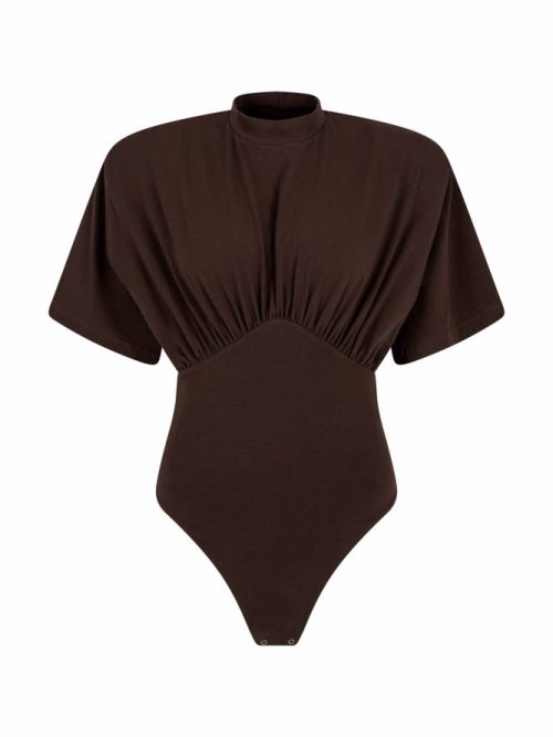 wielofunkcyjne body o wyrazistej, konstrukcyjnej formie z marszczeniem na dekolcie i poduszkami barkowymi.